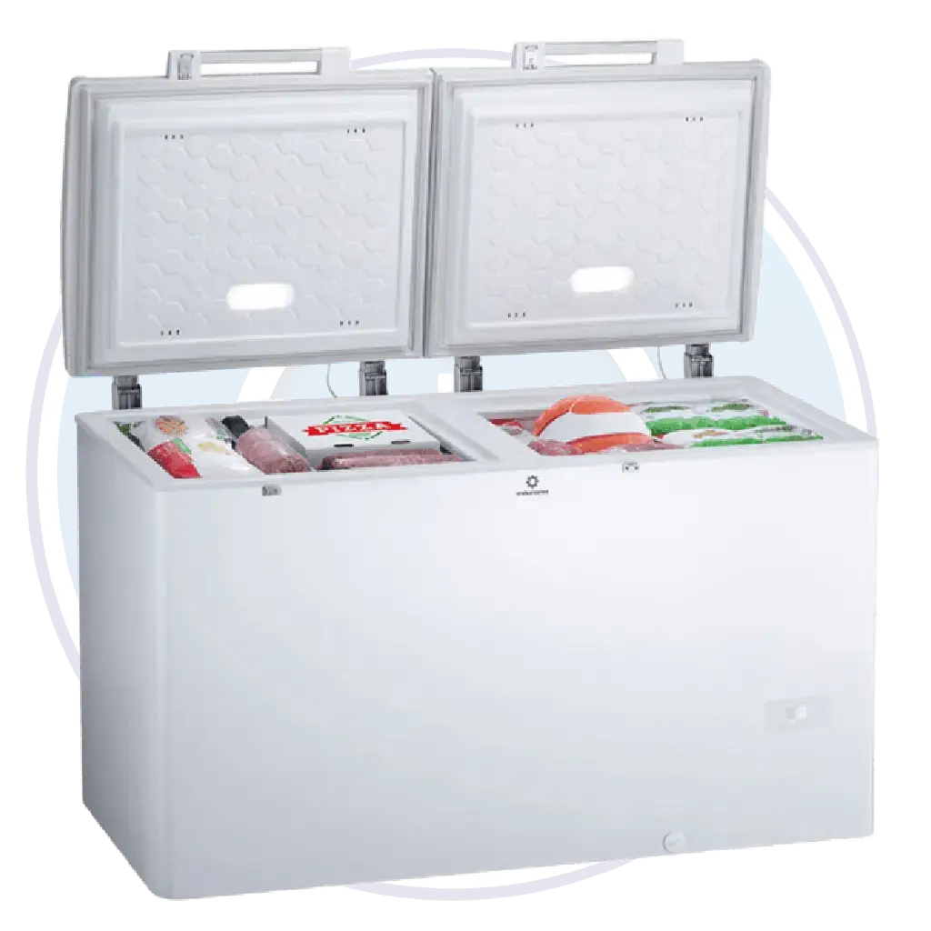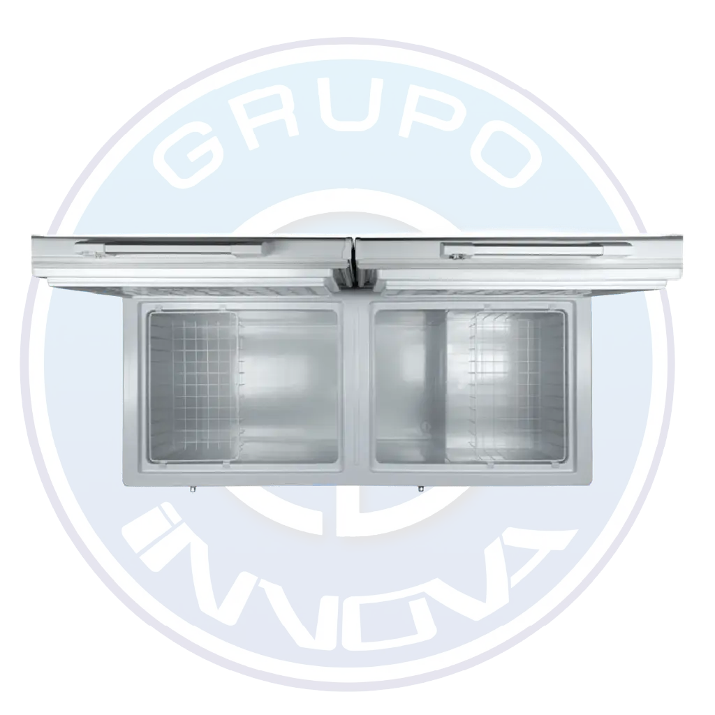Congelador Indurama de 400 litros con doble función (congela y enfría), doble tapa con llave, alta capacidad de almacenamiento y excelente rendimiento para uso comercial o doméstico.