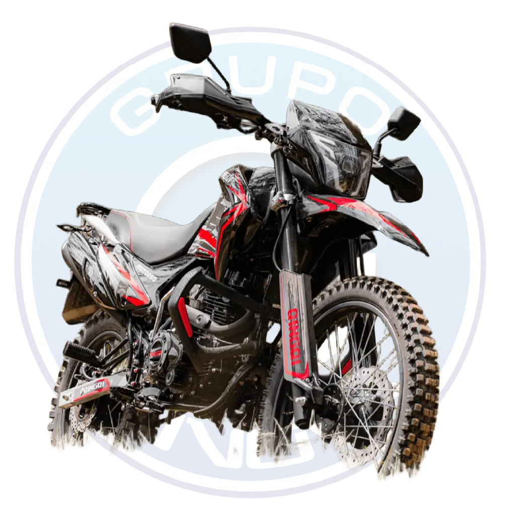 Su diseño tipo enduro incorpora una suspensión delantera telescópica de largo recorrido y un sistema trasero monoamortiguador, proporcionando mayor estabilidad y absorción de impactos en terrenos difíciles.