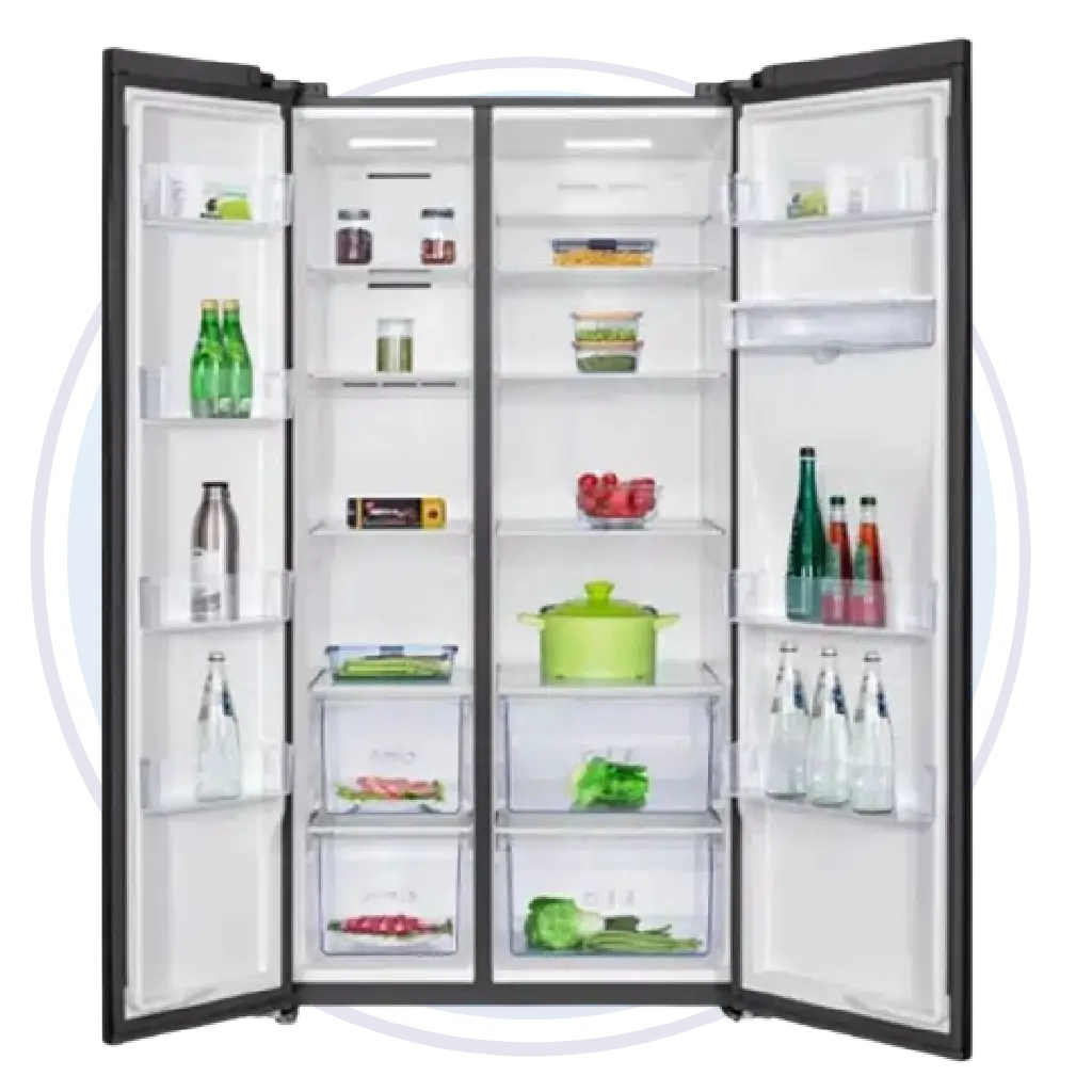 La Refrigeradora TCL P650SBGB 650L Side by Side con tecnología inverter ofrece gran capacidad, dispensador de agua y enfriamiento uniforme para el hogar.