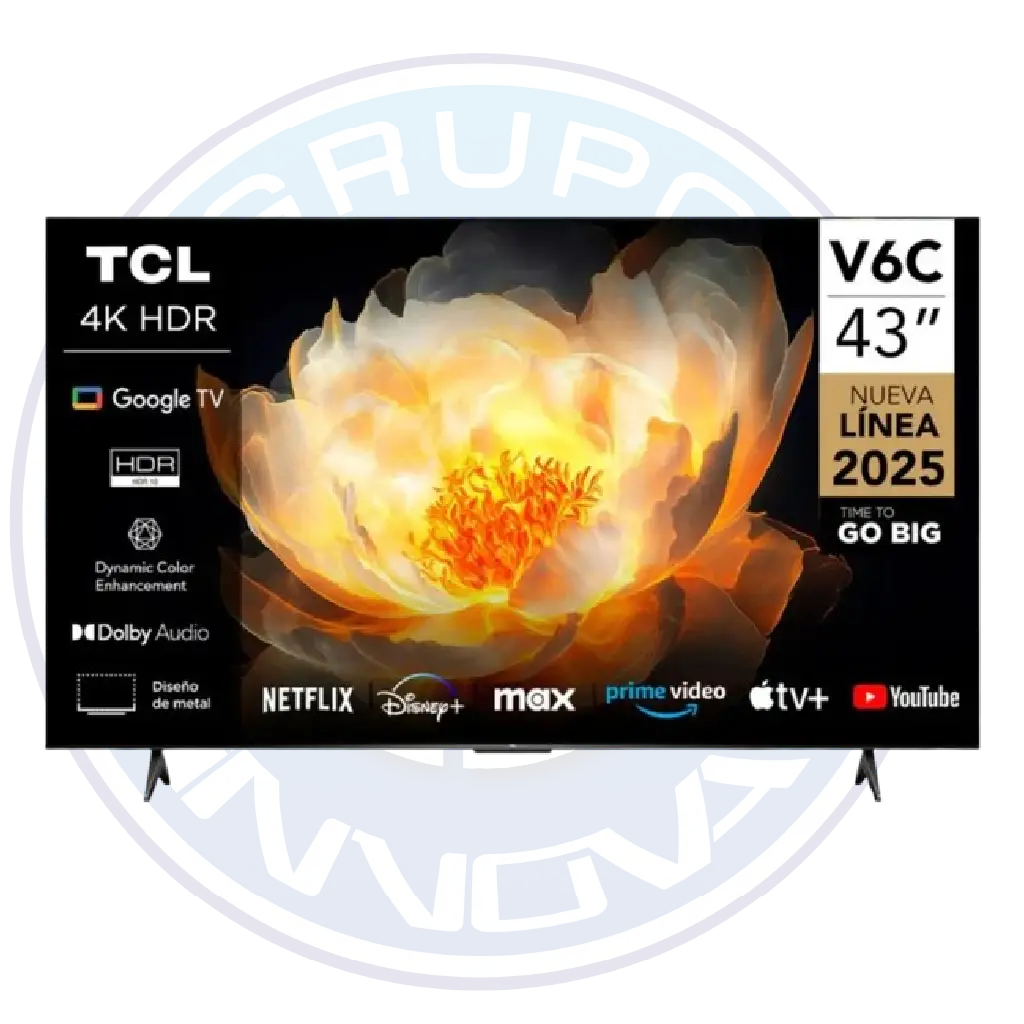Smart TV TCL de 43 pulgadas con resolución 4K UHD, Google TV, HDR10+, Dolby Vision, Wi-Fi, Bluetooth y control por voz.